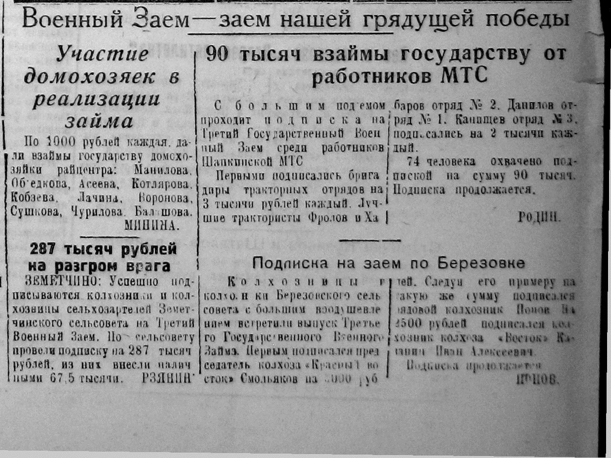 Колхозницы и колхозники Березовского сельсовета с большим воодушевлением встретили выпуск Третьего Государственного Военного Займа. Первым подписался председатель колхоза "Красный восток" Смольяков на 5000 рублей. Следуя его примеру, на такую же сумму подписался рядовой колхозник Попов. На 4500 рублей подписался колхозник колхоза "Восток" Ка?анин Иван Алексеевич.