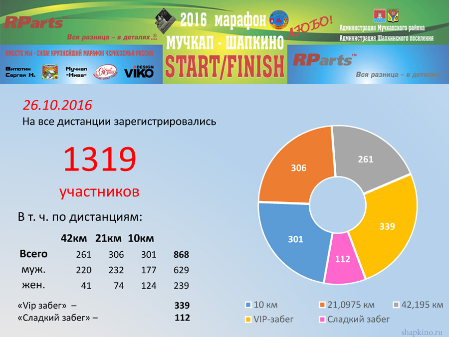 05.11.2016 Марафон состоялся!!!5 ноября 2016 г. состоялся V марафон «Мучкап-Шапкино-ЛЮБО!». Несмотря на минусовую погоду, в соревнованиях на дистанциях 42, 21 и 10 км приняли участие 649 спортсменов. С самого утра началась регистрация и выдача чипов тем марафонцам, которые не смогли зарегистрироваться вчера. До начала основного забега стартовали «тихоходы». В 10:30 начался основной этап марафона, и с разницей в 5-10 минут все спортсмены отправились на дистанции 10км, 21км, и 42км. После этого состоялись Сладкий и ВИП-забеги, в которых приняли участие и взрослые, и дети.